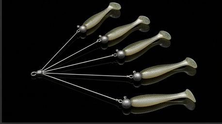 A multi-wire rig with 3–5 swimbaits that imitates a small school of baitfish moving together. The umbrella rig changed tournament fishing when it was introduced — the schooling effect triggers a competitive feeding instinct in predatory fish that a single lure can't replicate. Extremely effective in cold water when bass are feeding on baitfish balls. Note: check local regulations, as some states limit hook count.